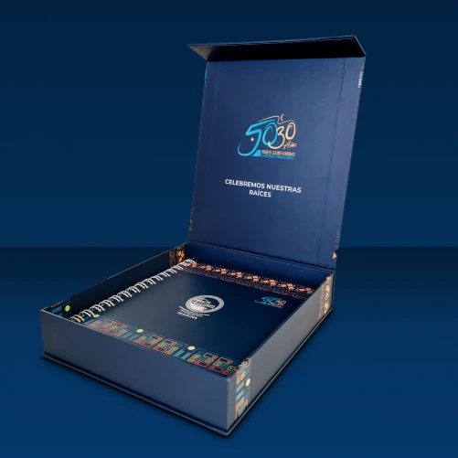 Realza la imagen de tu marca con acabados de alto impacto como barniz a registro, hot stamping y cold foil.